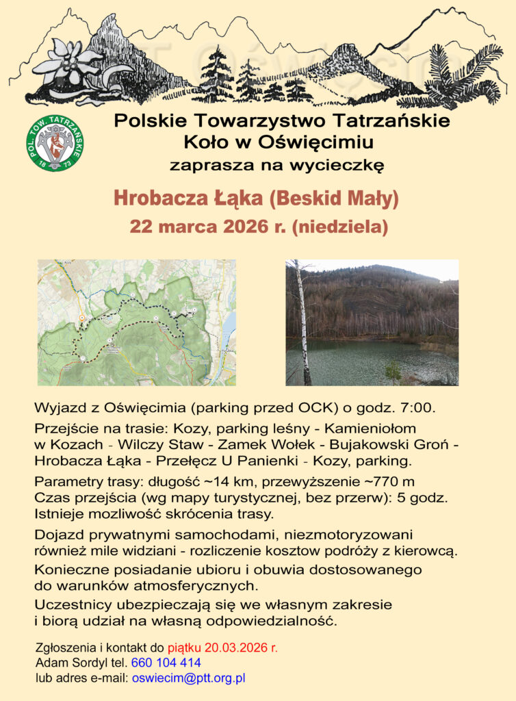 Beskid Mały jest nam bliski, ale jak się okazało nie do końca znany. Dla Oświęcimian dobry na krótsze wypady, co nie znaczy mało wymagający. 22 marca 2026 r. wykorzystaliśmy słoneczny dzień, aby w górach poszukać śladów wiosny, zobaczyć kilka krajobrazowych ciekawostek, dotrzeć na rubieże XIV-wiecznego księstwa oświęcimskiego, wspiąć się na flisz karpacki, zmęczyć się przy stromym podejściu na Bujakowski Groń i odpocząć przy domu turystycznym na Hrobaczej Łące. A wszystko to na zaledwie 14 kilometrach trasy, wiodącej najpierw skrajem koziańskiego kamieniołomu, który po wyłączeniu go z eksploatacji stworzył niezwykle urokliwe miejsce. Potem przeszliśmy nad pięknie położonymi w głębi lasu trzema stawami, których woda zasila dorzecze Soły. Kolejny wyznaczony tego dnia cel to zdobycie zamku Wołek – średniowiecznej strażnicy granicznej, której budowniczymi byli panowie na zamku w Oświęcimiu. Warownia padła naszym łupem z najmniej oczekiwanej przez dawnych właścicieli strony czyli z góry. Czytaj dalej