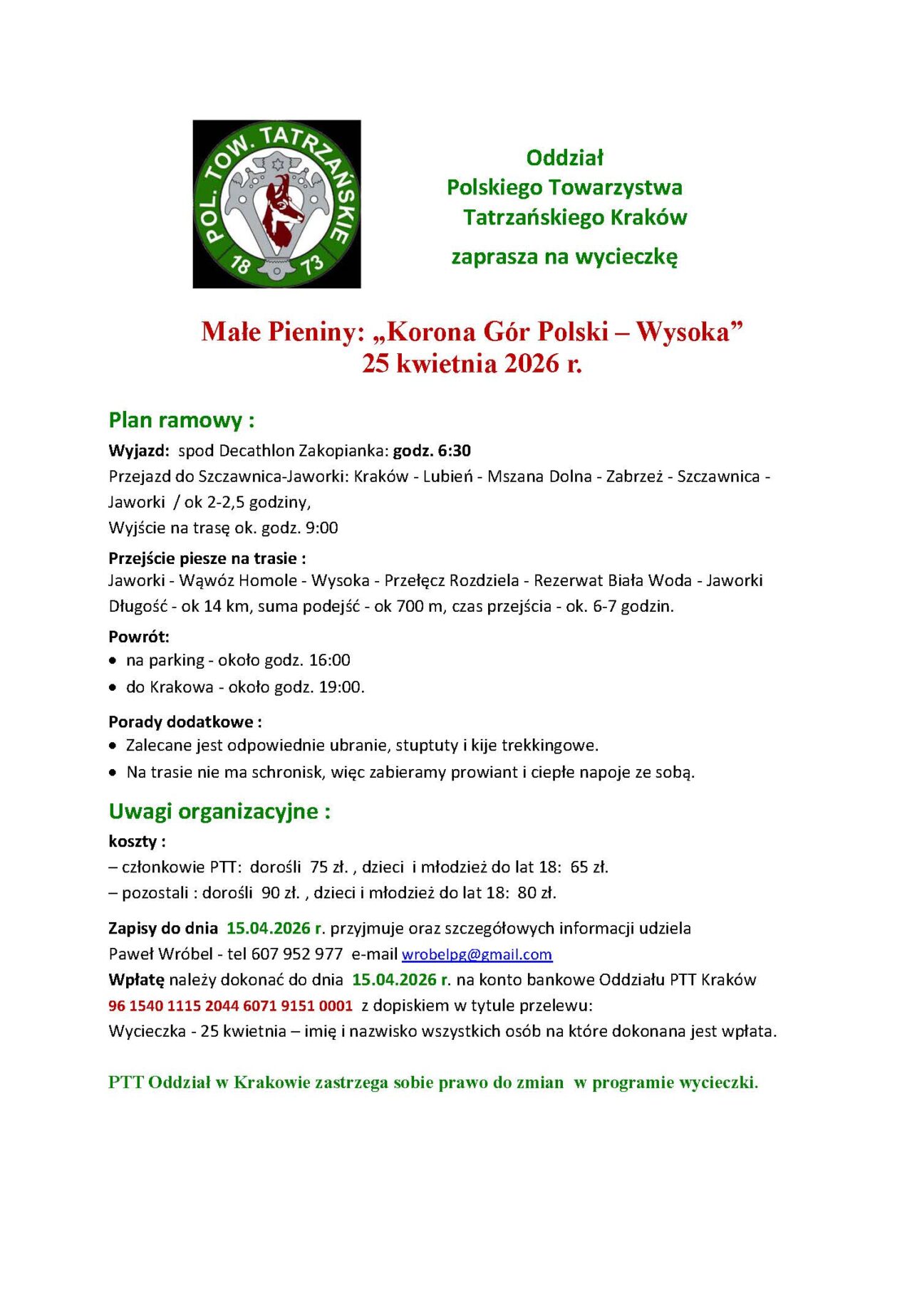 Wycieczka w Małe Pieniny: „Korona Gór Polski – Wysoka” 25.04.2026