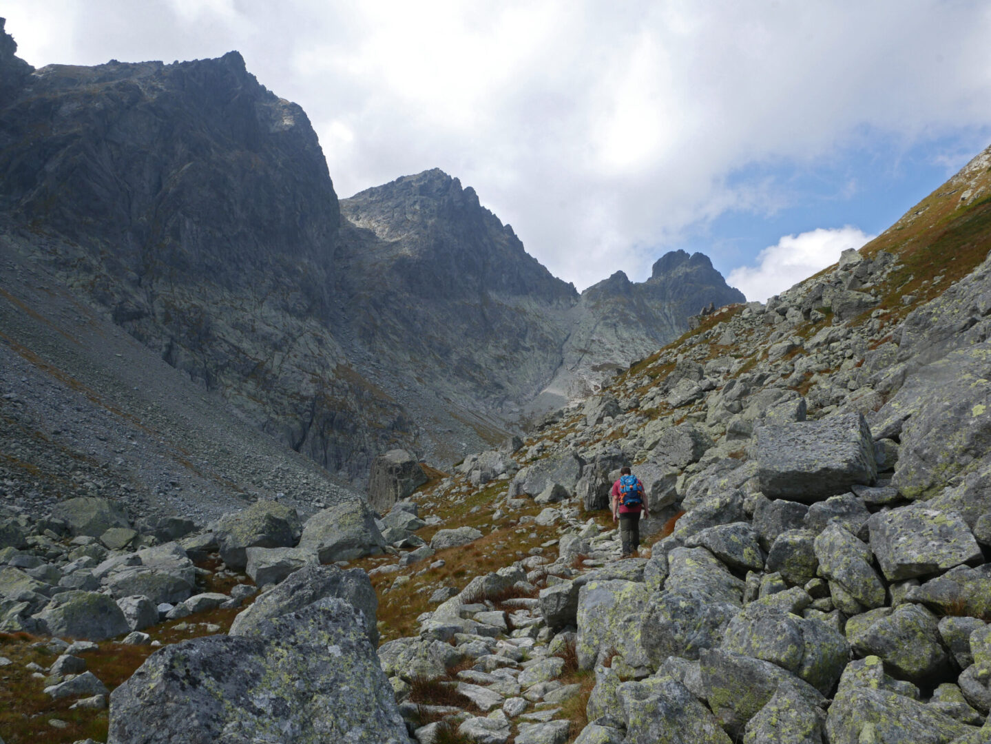 My, po krótkim odpoczynku i uzupełnieniu kalorii przy schronisku, ruszyliśmy w kierunku przełęczy Rohatka. Na pobliskich głazach wygrzewały się świstaki, nic sobie nie robiąc z fotografujących ich ludzi. Przy słonecznej pogodzie mogliśmy podziwiać otoczenie jednej z największych tatrzańskich dolin. U jej wylotu kłębiły się chmury, ale spoglądając w górę można było dostrzec ludzi na Sławkowskim Szczycie, imponująco prezentujący się Staroleśny Szczyt (słow. Bradavica), a po drugiej (wschodniej) stronie Jaworowy Szczyt, Pośrednią Grań, w dali na drugim planie Łomnicę. Szlak początkowo łagodny, wiodący wygodną ścieżką, w miarę zbliżania się do przełęczy stawał się coraz stromszy i nabierał wysokogórskiego charakteru, pojawiły się tęż łańcuchy.